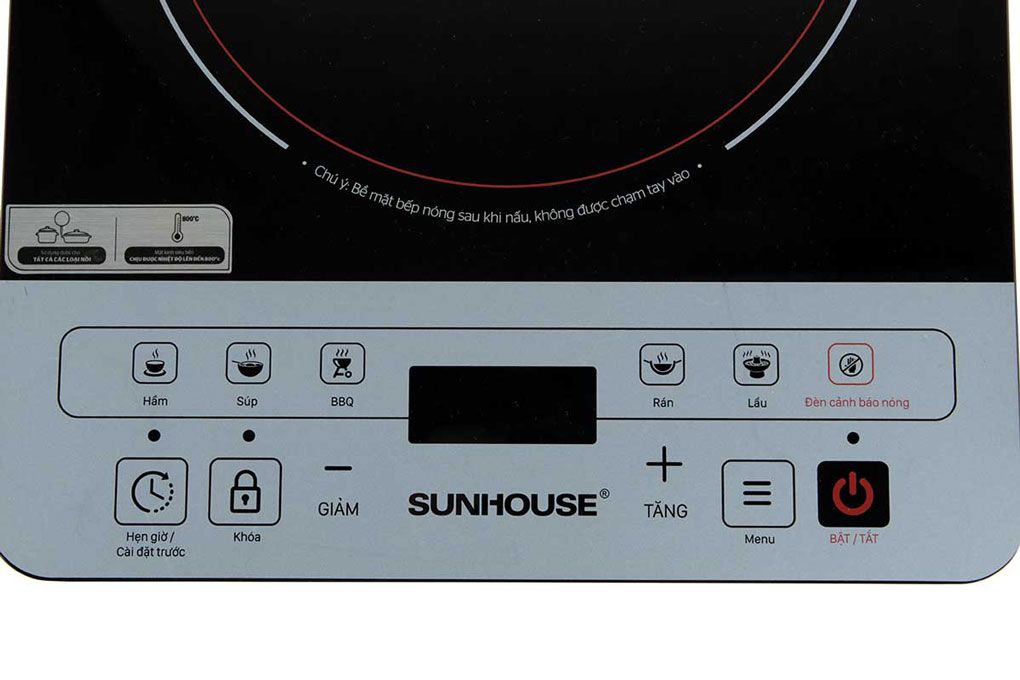 Bếp hồng ngoại Sunhouse SHD6005 sử dụng bảng điều khiển cảm ứng với các phím chức năng chỉ dẫn bằng tiếng Việt rõ ràng, dễ hiểu. Màn hình hiển thị đèn LED cung cấp các thông số chính xác giúp người dùng nắm bắt thông tin và điều chỉnh nhanh chóng phù hợp với món ăn.