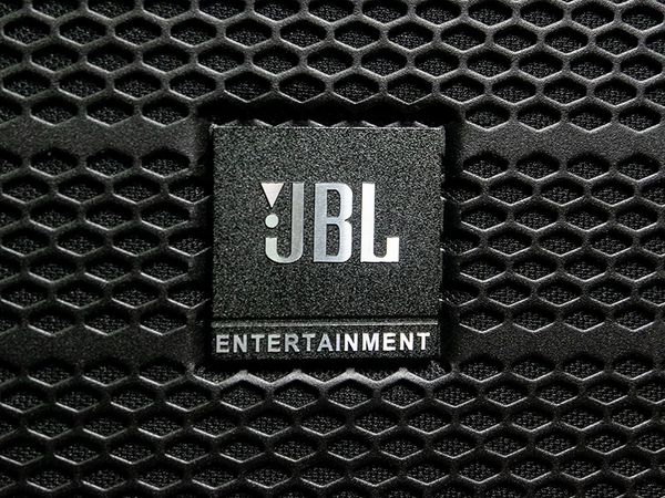 Loa karaoke có thể đặt đứng dưới sàn hoặc treo ngang, logo JBL xoay được 360o để phù hợp vị trí đặt loa.