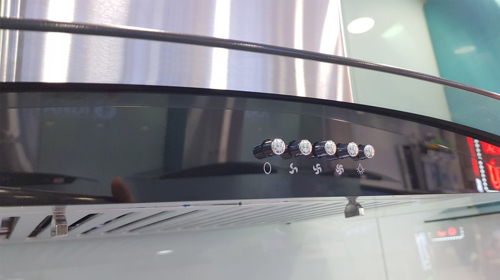 Máy hút mùi Chefs EH R506E7GG có khá nhiều sự thay đổi về thiết kế so với phiên bản R506E7 và 506E7S trước đó, thay đổi đầu tiên là “em nó” khu vực mặt chắn đặt bàn phím điều khiển là mặt kính đen thay vì mặt inox như trước, và dường như thiết kế này làm nổi bật các nút ấn của máy.
