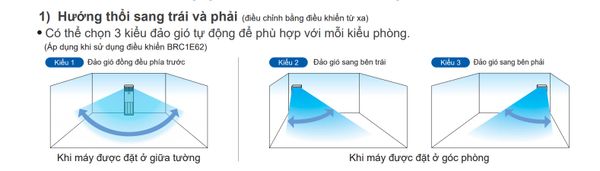 Có thể lựa chọn 3 kiểu thổi gió tự động (thổi về phía trước, thổi sang trái, thổi sang phải) để phù hợp với cấu trúc phòng (Áp dụng khi sử dụng điều khiển BRC1E62)