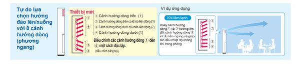 Hướng thổi lên xuống: Đảo gió lên xuống độc lập nhanh chóng phân bổ nhiệt độ đồng đều trong phòng, giúp tiết kiệm điện năng