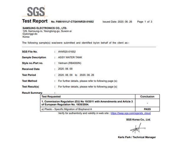 Nhờ được làm bằng vật liệu nhựa không chứa chất BPA gây ung thư đã được tổ chức SGS Test kiểm chứng về chất lượng và độ an toàn, người dùng sẽ không cần lo lắng về những ảnh hưởng của khay nhựa lấy nước đối với sức khoẻ người dùng. Giấy chứng nhận BPA Free
