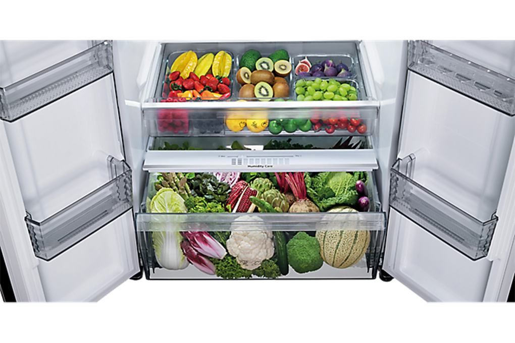 Ngăn rau quả 2 tầng siêu rộng giúp người dùng dễ dàng phân loại, sắp xếp thực phẩm một cách khoa học, ngăn nắp và lấy đồ nhanh. Ngăn trên dành cho các loại trái, ngăn dưới để bảo quản các loại rau củ cỡ lớn, rau xanh. Cấu trúc khép kín cùng nút gạt điều chỉnh giúp duy trì độ ẩm thích hợp, giữ điều kiện tối ưu với độ ẩm lên tới 90%. Luồng khí gián tiếp giúp ngăn rau không bị khô, nhiệt độ ổn định, nhờ đó, rau quả luôn tươi ngon trong thời gian dài.